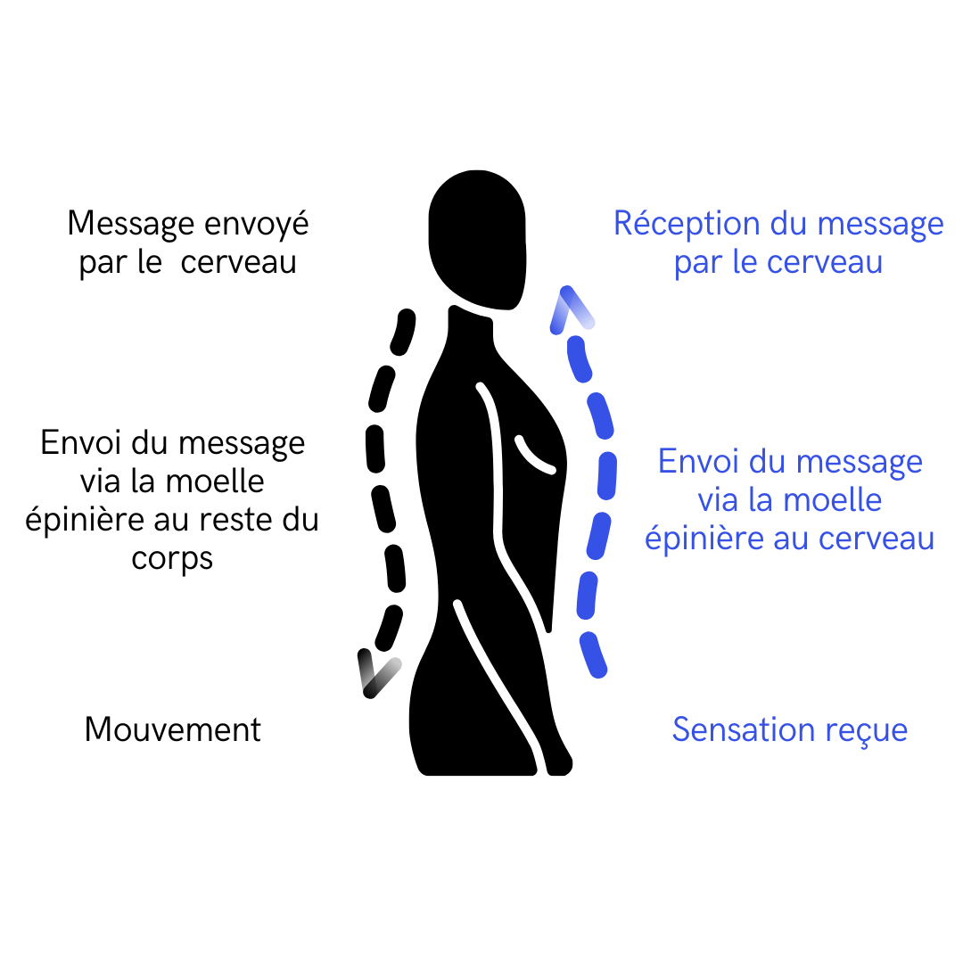 On peut se représenter la moelle épinière comme un gros câble électrique, situé le long de notre colonne vertébrale, et qui a pour mission de transmettre les messages entre le cerveau et le reste du corps.