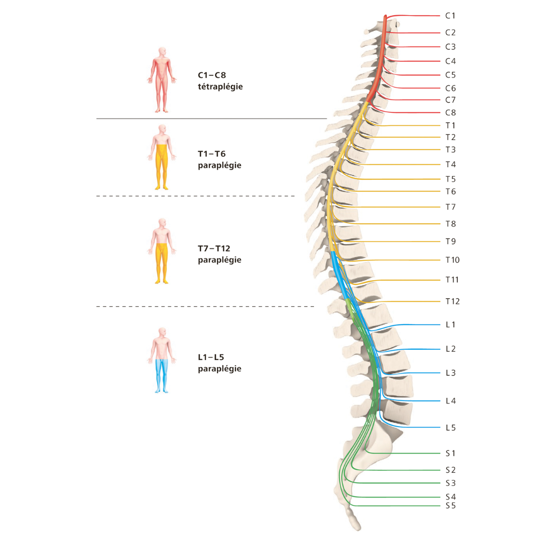On est paraplégique si la lésion de la moelle épinière se situe à partir de la vertèbre T1 et jusqu’au bas du dos. Les deux membres inférieurs sont alors touchés.